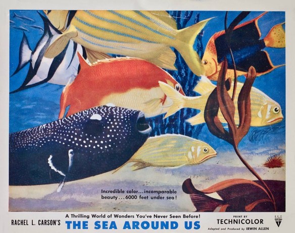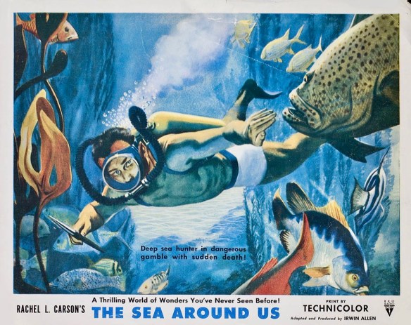 Regardless of Rachel Carson’s poor opinion of Allen’s adaptation of The Sea Around Us, the film certainly didn’t hurt her reputation or popularity and may have even enhanced it as the documentary reached audiences which might not have read any of her books. It was also well received by most film critics and reviewers. A typical example was Bosley Crowther’s review in The New York Times: ” The pleasure of ichthyologists and those who respond to the allure of the beauties and mysteries of the oceans and the wonders of the deep should be served in satisfying abundance by Irwin Allen’s Technicolored nature film “The Sea Around Us”…. For this assemblage of vivid color footage, which bears the name, at least, of the popular volume on oceanography and evolution that Rachel L. Carson wrote, is full of handsome pictures of the ocean, of fishes, of birds and of marine life, from microscopic creatures to giant Antarctic whales.”