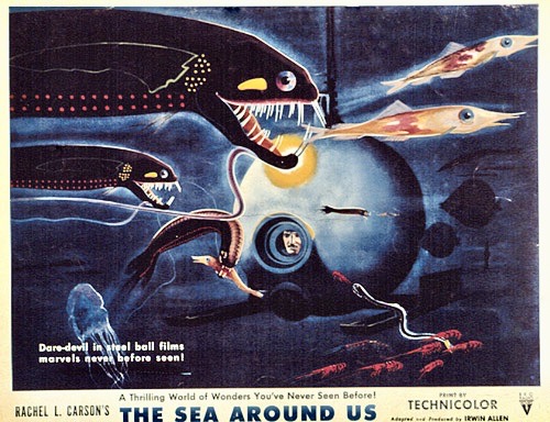 When The Sea Around Us was published in 1951, it became a best seller for Carson and RKO Studios quickly purchased the film rights with the intention to turn it into a documentary. Allen, who already had an impressive resume of magazine and advertising work by this time, was hired to write and direct the movie adaptation and Carson was hired as a consultant – but not on the script. She was only retained for her input on film footage selected for The Sea Around Us and had no power to change or alter Irwin’s editorial approach to her book. The resulting film is one of the most unintentionally amusing and wrong-headed attempts by Hollywood to turn a landmark book of scientific investigation into an accessible entertainment for the masses.