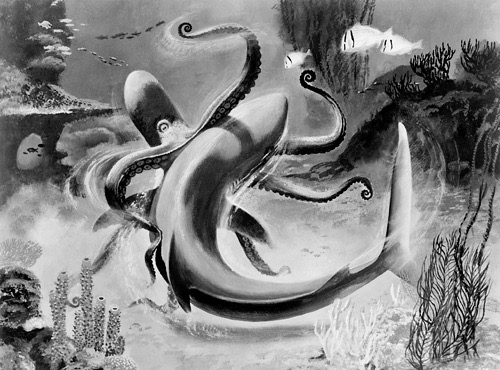 A storyboard illustration from the 1953 documentary The Sea Around Us, produced and directed by Irwin Allen.