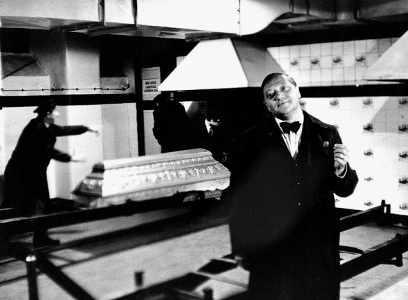 Karl (Rudolf Hrusinsky) has a vision of expanding the crematorium business in Juraj Herz’s The Cremator (1969).