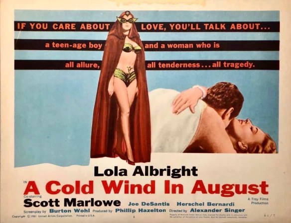 Every once in a while a low-budget independent film with a no-name cast will come along and captivate critics and audiences alike with its audaciousness, honesty and ability to transcend easy categorization. In the film industry, they sometimes call this a “sleeper” and, while this kind of movie rarely becomes a box office hit, it can acquire a cult status or insider buzz that saves it from falling off the radar and vanishing into obscurity. Such is the case with A Cold Wind in August (1961), a steamy little adult drama that was targeted for grindhouses and the drive-in trade with the tagline: “If you care about love, you’ll talk about a teenage boy and a woman who is all allure, all tenderness…all tragedy.” The poster depicted two lovers in a torrid horizontal embrace while the figure of an exotic stripper, dressed in an open cape and eye mask, towers over them, revealing her shapely, half-naked body.