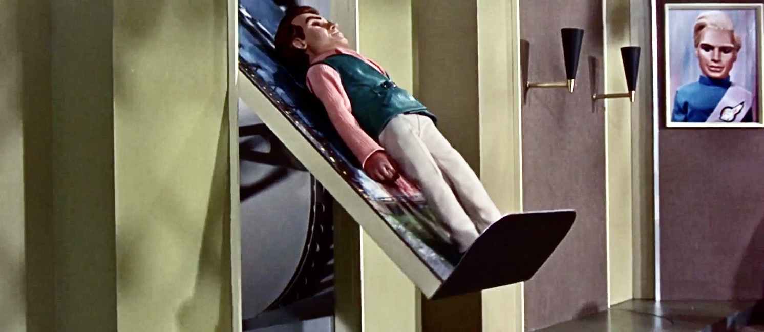 Thunderbirds Are GO (1966) Published June 23, 2020 at 1492 × 648 in Marionettes in Outer Space A scene from Thunderbirds Are GO (1966) features Virgil Tracy ready for action on the launch slide.
