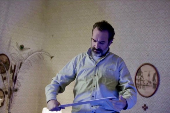 Georges (Jean Dujardin) pulls down a ceiling fan and begins sharpening the fan blades – but for what purpose? in Deerskin (2019).