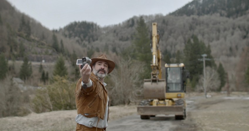 DEERSKIN (2019) Published July 13, 2020 at 4096 × 2160 in Clothes Make the Man Georges (Jean Dujardin) posing with a bulldozer for his film-in-the-making in DEERSKIN (2019) – Courtesy of Greenwich Entertainment