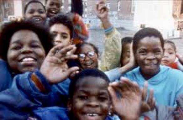 Street kids in Bridgeport, Connecticut mug for the camera in Route One USA (1989), directed by Robert Kramer.
