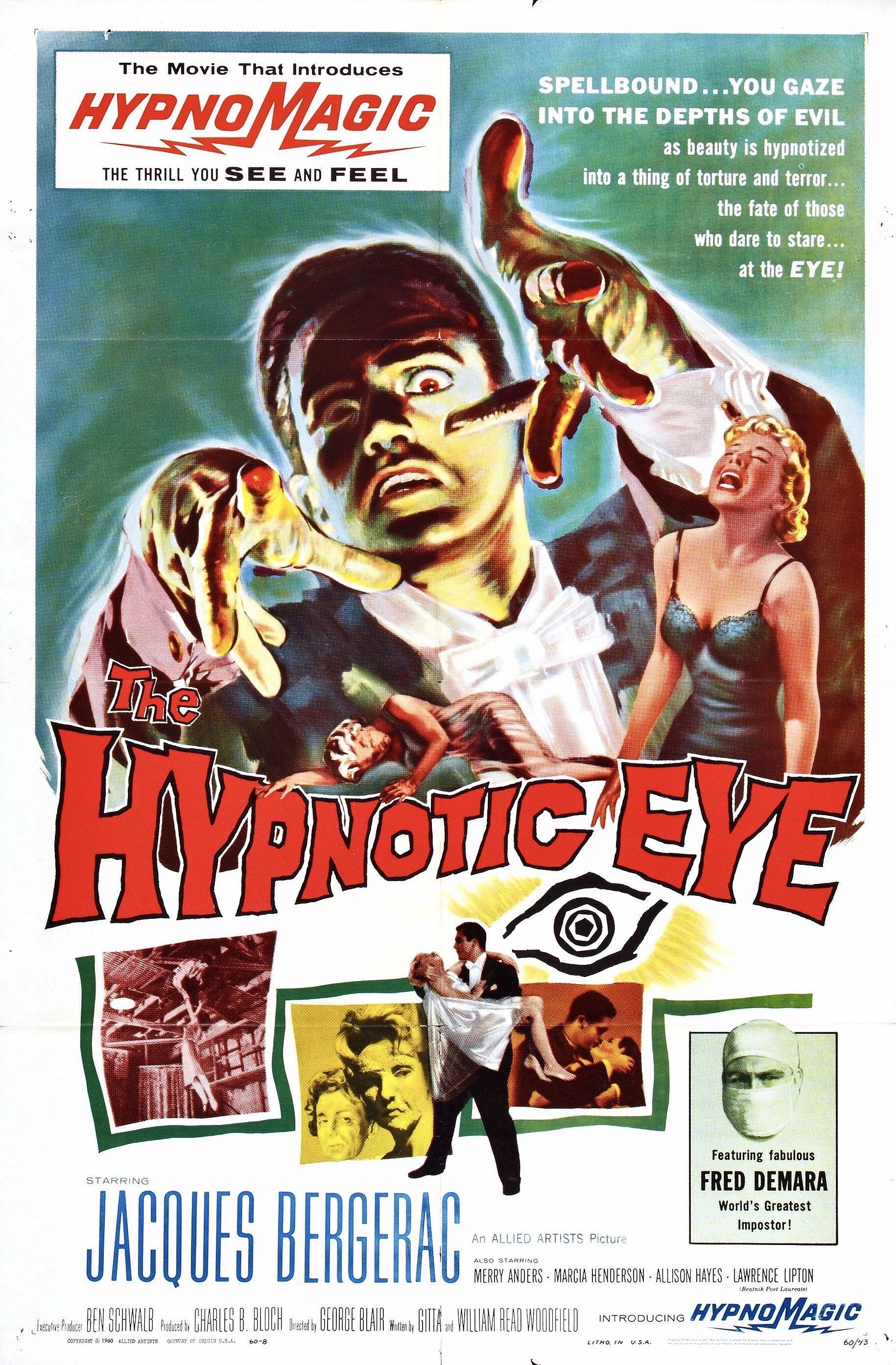 Jacques Bergerac is Desmond the Great, a famous hypnotist who is linked to a series of female self-mutilations in The Hypnotic Eye (1960), directed by George Blair.