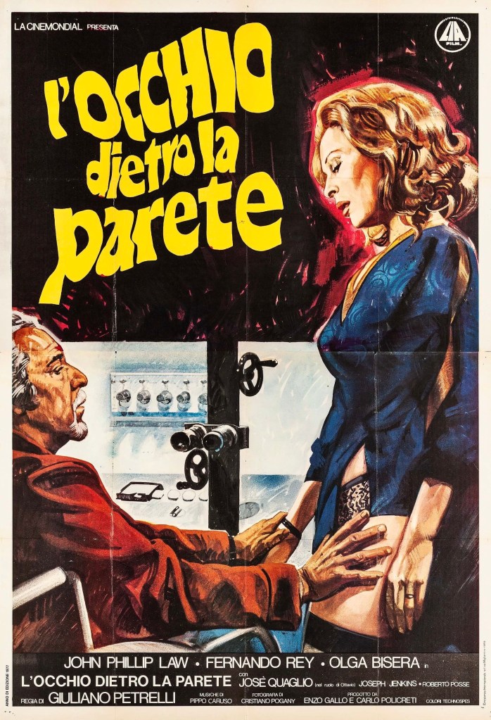 Sometimes a film poster doesn’t offer enough information to let you know what kind of movie to expect. Take, for example, Eyes Behind the Wall (Italian title: L’occhio dietro la parete, 1977). The Italian poster suggests it might be an erotic drama with its image of an older man touching the exposed thigh of a younger woman. The background paraphernalia and laboratory setting could also indicate a sci-fi or horror premise. The American poster for the film displays a demented face, an oversize bloody knife and a topless female victim in the style of a trashy giallo. The simple truth is that Eyes Behind the Wall is hard to classify and doesn’t easily fit into any specific genre although you could file it under Eurotrash. While the film is problematic in many regards, it still manages to be consistently intriguing and unpredictable.