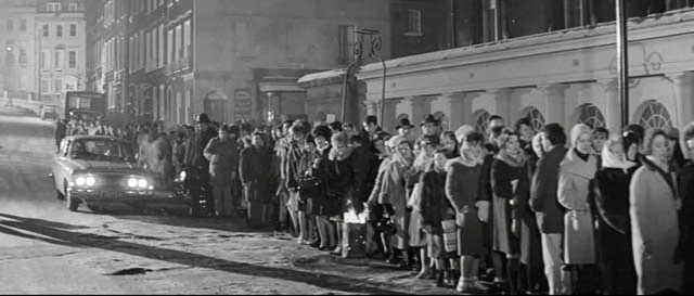 Val Guest recalled the making of the film in an interview with Roy Fowler for The British Entertainment History Project in 1988. He said that 75 percent of the movie was shot in Bath and the rest at Pinewood Studios. “The day we started was the coldest temperature in living memory and there was snow everywhere and we had to say is this going to last because either I had to shoot in snow for three weeks or wait till it thaws. What am I going to do? So I called [executive producer] Earl St John about it, we start now, we kick off in snow, but send us however many trucks our location manager wants to be able to be put our own snow down, salts. We’ll have them standing by so we can duplicate, which is what we did. And…we had to get snow ploughs to where we were shooting.” Guest also had to supply a large number of braziers (portable heaters) for all the street scenes but kept them out of camera range. Despite this additional warmth, it was still bitterly cold and you’ll notice the breath of the actors often appears in these night scenes.