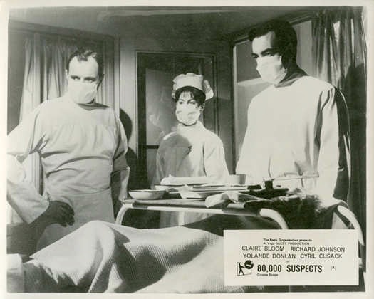 The idea of a smallpox outbreak in 1963 was not that far-fetched as a premise. The last major smallpox eruption occurred in New York City in 1947 but was effectively thwarted by quick action from the medical community via mass vaccinations. Of the 12 people who caught the virus, only 2 died. (The 1950 film noir The Killer That Stalked New York was partially inspired by this incident). As recently as 1962, the disease reared up again in the city of Bradford, England where the carrier was suspected to have been a man from Pakistan who arrived on a flight to Heathrow Airport in London. Once again an epidemic was quickly contained with only six fatalities but that incident was enough to make 80,000 Suspects a timely film. And, as you probably know, survivors of smallpox are sometimes left blind by the virus and their bodies horribly scarred like something out of a horror film.