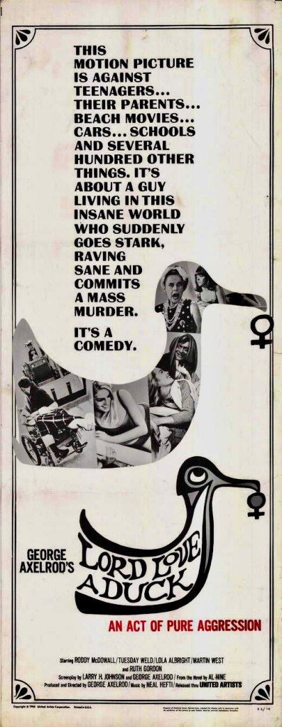 The director said in an interview, “I love, for all its mistakes and dumbness, Lord Love a Duck…I can’t imagine why it wasn’t a hit. It got no reaction. I couldn’t get anybody into the theaters to see it. It was one of those pictures that died. United Artists sold the shit out of it. I went on the road with it. I got reams of press. I ran what I thought was a clever ad campaign, parodying all the other campaigns. “Suddenly last summer, United Artists realized it was being used for something evil . . . Lord Love a Duck! “