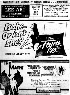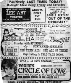 Among my favorite movie houses were the Byrd (local musical legend Eddie Weaver would rise up out of the floor playing the organ and introduce the evening movies), the Grand with its fun double bills of The Minotaur and Revolt of the Slaves and like-minded fare, and the Westhampton, which must have been run by an Anglophile since it always played the recent British comedies and anything with Peter Sellers and Margaret Rutherford. By far the best bang for your buck was the Sunset Drive-in with its dusk-to-dawn line-up of five unrelated features. But I never got to attend the movie house that intrigued me the most. The Lee Theatre had been in operation since 1935 but closed in 1963 – Carry On Teacher was its final film showing. It then reopened in September 1965 as the Lee Art Theater. I immediately became fascinated by the theater’s new programming slate and provocative ad promotions.