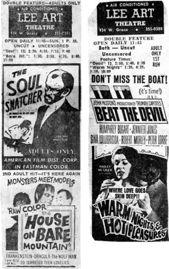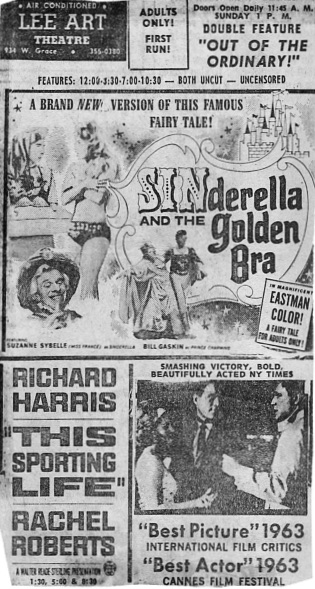 From 1965 until 1968, the Lee-Art Theatre ran some of the most eclectic double features I’ve ever come across and formed my opinion of what a true art cinema should be – a mixture of the highbrow, the lowbrow and the controversial with a distinct sense of humor balancing the programming. I don’t think there was a theater anywhere else in the world that ran double features like Sinderella and the Golden Bra and the Oscar nominated English drama, This Sporting Life, directed by Lindsay Anderson. Or John Huston’s Beat the Devil and Radley Metzger’s Warm Nights and Hot Pleasures.