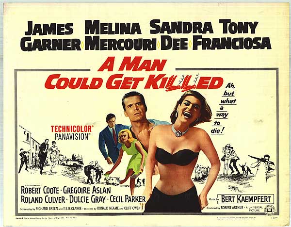 Even as a pre-teen, I always had a keen interest in movie promotions in the newspapers. I would study the poster image, the featured actors, the taglines and slogans, the title treatment, even the font style if it imparted any kind of information about the movie’s essence. Consider, for example, the title treatment for A Man Could Get Killed in which the two L’s in Killed are represented by dead men with their legs up in the air.