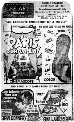 The programmer was clearly targeting couples with a guilty pleasure as bait but offering a respectable or even critically acclaimed title to validate their attendance. Unfortunately, the Lee Art Theatre never quite achieved that “art house” respectability or regular attendees and was eventually forced by financial necessity to cater to the raincoat crowd with softcore movies like The Girl From S.I.N. and Olga’s Dance Hall Girls.