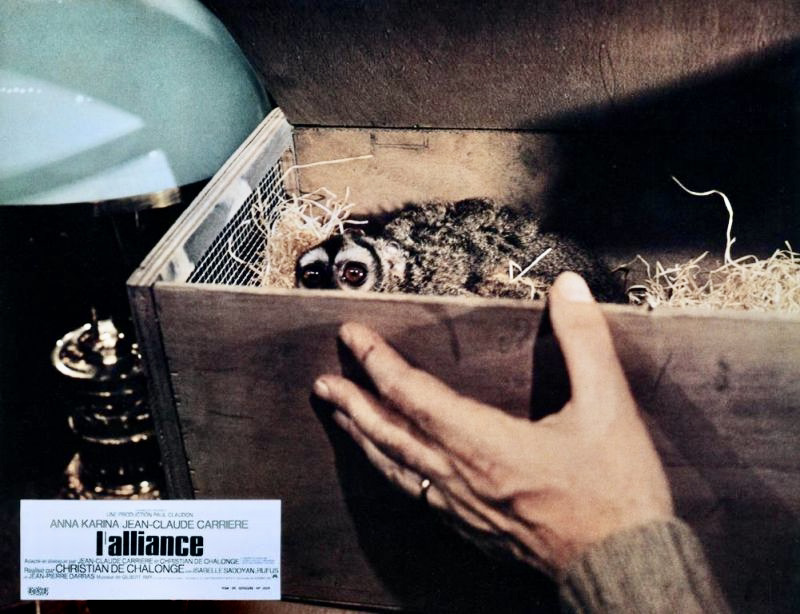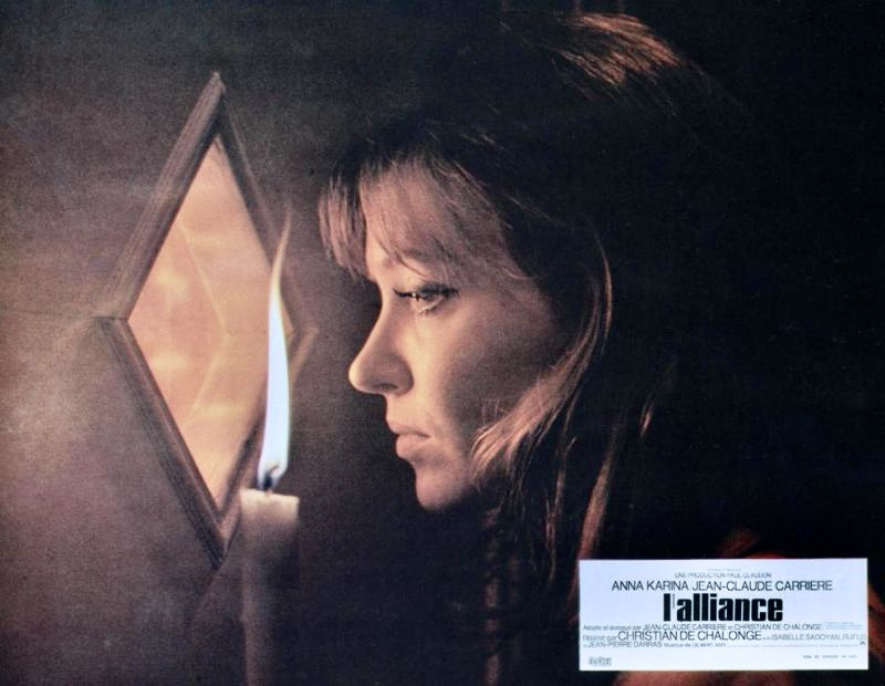 L’Alliance is less overtly bizarre and outlandish than some of Carriere’s other work but there is a strange, off-kilter quality to the narrative that keeps you guessing right up to the final fade-out. For example, what is Jeanne (played the luminous Anna Karina) getting out of a marriage to Hugues? Her motives are inscrutable and she may not be who she pretends to be. During her first meeting with Hugues, they are interrupted by a surprise visit from Duvernet (Jean-Pierre Darras), who takes Jeanne aside and gives her a box containing two siamese cats. He tells her, “Just pretend you like them, He’s a veterinarian.” Hugues eavesdrops on this conversation and it plants a seed of suspicion about his intended bride-to-be. It also makes the viewer wonder as well. Are Duvernet and Jeanne conspirators in some plot to hoodwink Hugues? Yet this becomes a meaningless red herring as further developments raise more important questions about Hugues and Jeanne’s relationship.