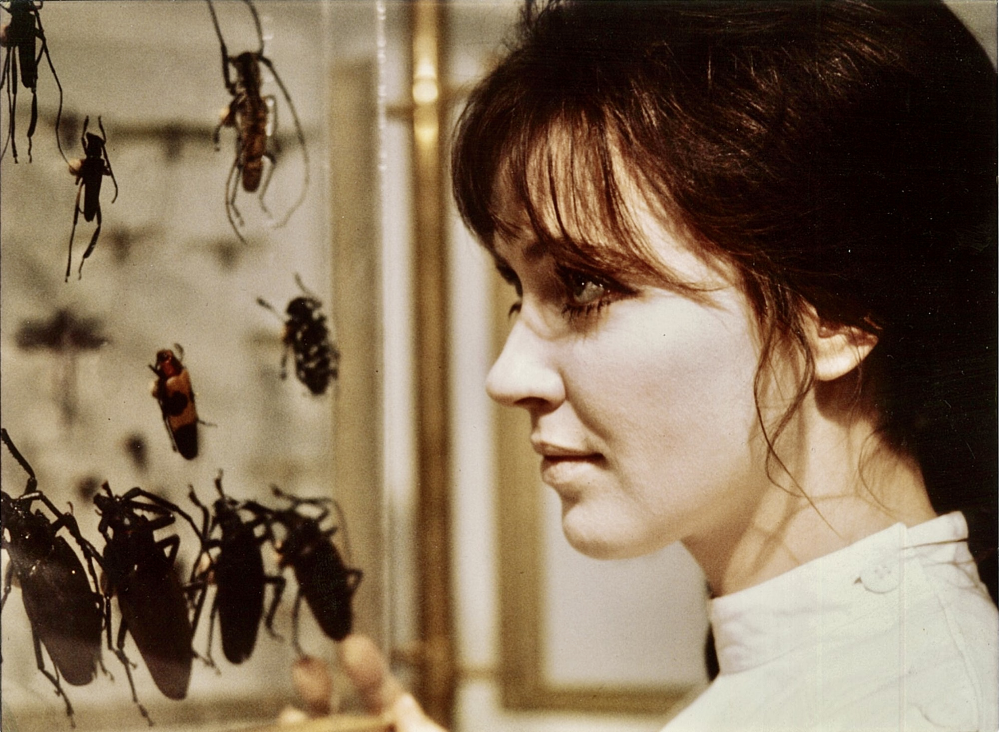When you think about it, director de Chalonge and Carriere’s entire conception of L’Alliance reflects a cool, detached observational quality as if Hugues and Jeanne, and not the animals, are under the microscope. Their behavior and growing paranoia about each other are orchestrated like a science experiment under controlled conditions. The cinematography by Alain Derobe and the production design by Hubert Montoup further enhance the cluttered laboratory-like environment of the house with fish tanks, wall to ceiling cages, and large photographic close-ups of insect heads in the study. At one point, Hugues even subjects his dinner guests to 16mm footage of lizards stalking and eating their prey.