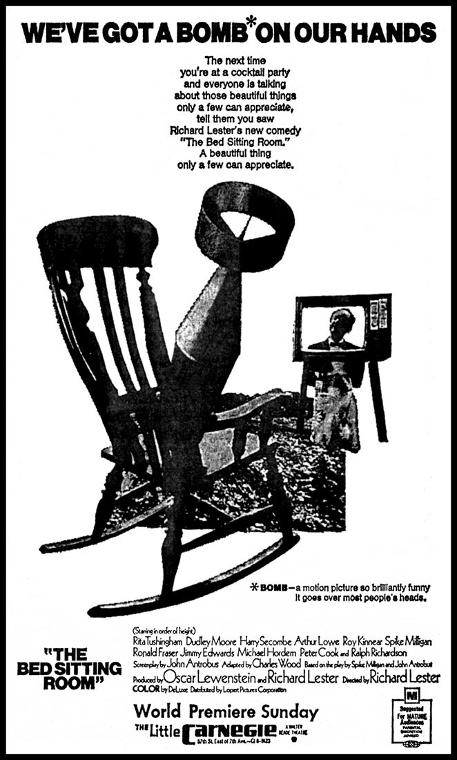 Not even the renowned actors and comedians featured in The Bed-Sitting Room could convince moviegoers to see the movie and most critics were baffled by it. Pauline Kael’s comments reflected the genuine attitude at the time: “One laughs from time to time, but, as in so much modern English far-out satire, there’s no spirit, no rage, nothing left but ghastly, incessant sinking-island humor. We end up blank, and in need of something we can connect with, to restore perspective, because this perpetual giggle almost seems to require a bomb.”