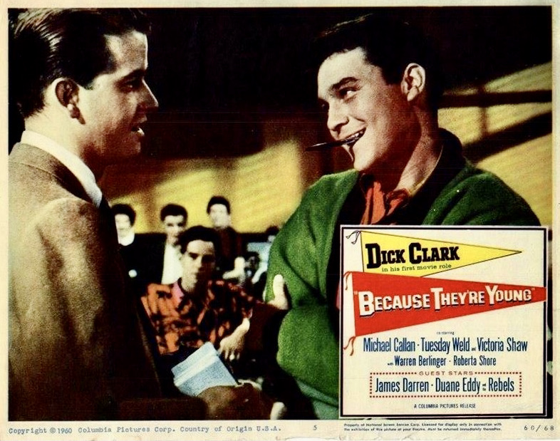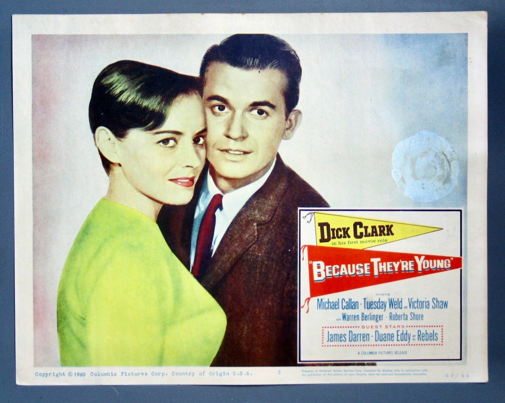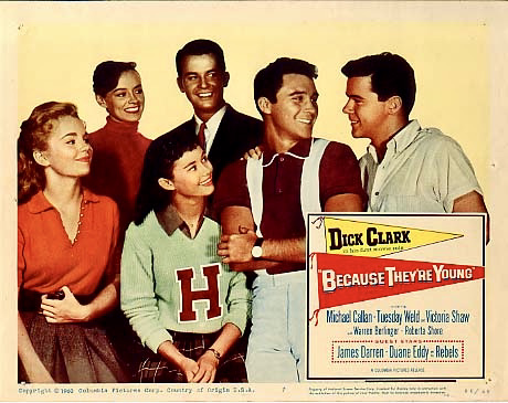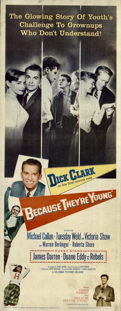 I’m a sucker for any film starring Tuesday Weld. Ditto any high school/teen angst/juvenile delinquent flick from the fifties and sixties. Toss in American radio and TV personality Dick Clark in his dramatic film debut and musical appearances by the “King of Twang” Duane Eddy and Because They’re Young (1960) becomes essential viewing.
