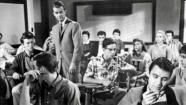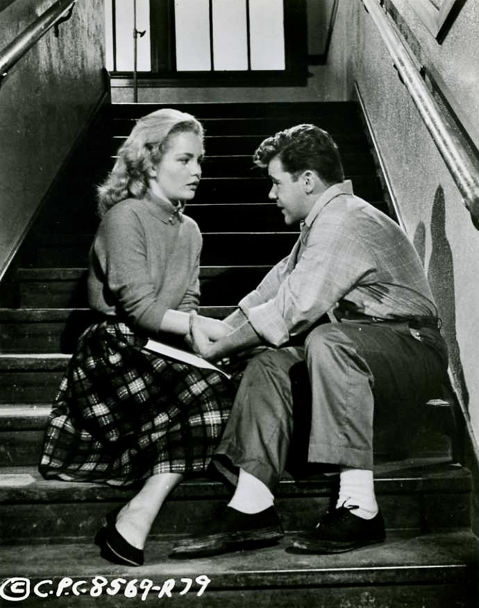 Still, Neil’s problems are minor compared to say, Griff Rimer (Michael Callan), the school hoodlum who is being recruited for a local crime ring run by the neighborhood butcher out of his tiki lounge bachelor pad. Or Buddy McCalla (Warren Berlinger), who suffers from an inferiority complex made worse by an absent father and an alcoholic slattern of a mom (Linda Watkins). Or Anne Gregor (Tuesday Weld) who is struggling to be virtuous after transferring from another high school where her reputation was sullied after having sex with Griff. There is also Ricky (Roberta Shore), who is being pressured to give up her virginity by Jim (Doug McClure). Even Joan (Victoria Shaw), the principal’s cool, collected secretary who falls for Neil, has a deep, dark secret. You can count on each one of them getting their big confessional moment in this soap opera-like morality tale which feels strangely conservative and ends on an unconvincing happy note with all the loose ends tied up. It fails as drama but as a case study of fifties attitudes, it’s often fascinating.