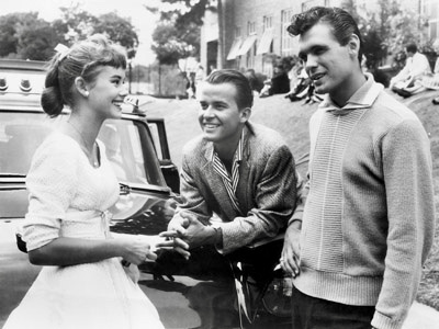 The cast credits that roll by are an encapsulation of fifties pop culture. Besides Clark, the popular host of ABC’s American Bandstand which began its national TV syndication in 1958, there’s Michael Callan (who won Golden Globe’s Most Promising Male Newcomer for this), Tuesday Weld, Roberta Shore, Doug McClure, Victoria Shaw, Warren Berlinger, James Darren and Bobby Rydell (who doesn’t appear but we hear his voice on the radio crooning “Swingin’ School”). On the production side is composer John Williams – yes, the John Williams of 52 Academy Award nominations and 5 Oscar wins (Fiddler on the Roof, Jaws, Star Wars, E.T., Schindler’s List) – director Paul Wendkos (who helmed three Gidget movies starting with the original 1959 Sandra Dee hit) and producer Jerry Bresler who is better known as a songwriter and composer, scoring best-selling songs like “Johnny Angel,” “Five Guys Named Moe,” and more.
