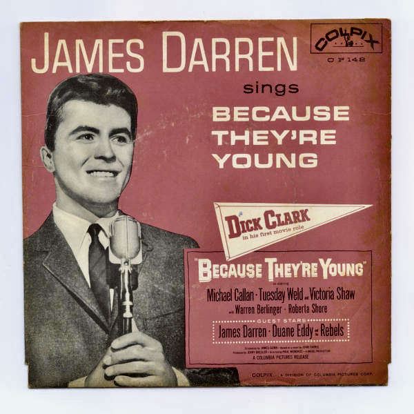 Because They’re Young has a promising open with the introduction of Dick Clark (who gets a movie star closeup and headliner screen credit) as a high school teacher. We see him pulling up in his convertible in front of his new gig, Harrison High, with his young nephew in tow (we get the tragic backstory later). Then Eddy’s rousing instrumental version of the top forty theme song kicks in and for a moment, it sounds like we’re being prepped for an urban western as Eddy’s rendition conjures up memories of Shane and other “walk proud” frontier themes (You can hear a slower, ballad version by James Darren later in the film, but more about that in a minute). Visually, the open might not have the artistry of a Saul Bass title sequence but Eddy’s theme song is matchless and you can strut to it.