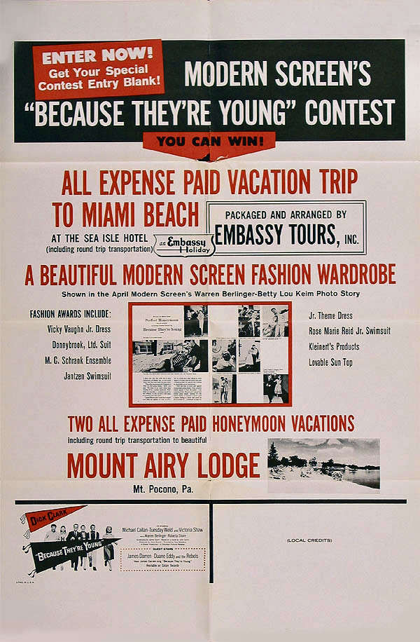 Of course, the dialogue is frequently unintentionally funny with Clark spouting bits of wisdom like, “Look, we don’t love people because they’re perfect. If we did, you’d soon find out there’s nobody to love at all.” All of the above touches help make Because They’re Young more interesting now than it probably was during its original run and is one of the reasons I’ve devoted an entire post to a movie that is mediocre, instead of an established classic or neglected gem. Think of it as pop cultural anthropology. So, if you are at all interested in the late fifties/early sixties and the way people talked, thought and behaved within the context of a Hollywood movie about high school life, Because They’re Young is a great place to start. Sometimes you might be surprised at what you find.