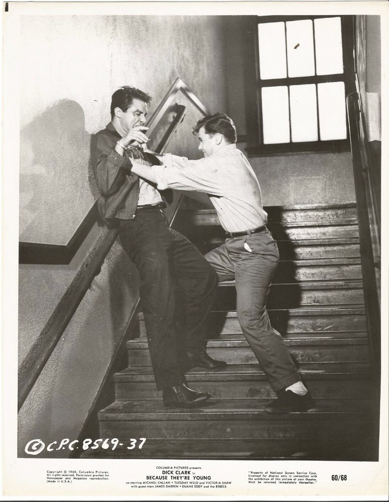 Despite the sensationalistic ad campaign and trailer, Because They’re Young is a candy ass version of Blackboard Jungle with Dick Clark as Neil Hendry, a more benign Glenn Ford. He’s a bright, idealistic teacher rebounding from a disastrous student teaching experience where he got too involved with the problem students and was dismissed as a result. We also learn he was once a star quarterback – yeah, right – whose promising football career was brought to an end by a car wreck that killed his brother and sister-in-law. Now he’s out to prove himself to a strictly by-the-rules principal and rival faculty members and win custody of his orphaned nephew at the same time.