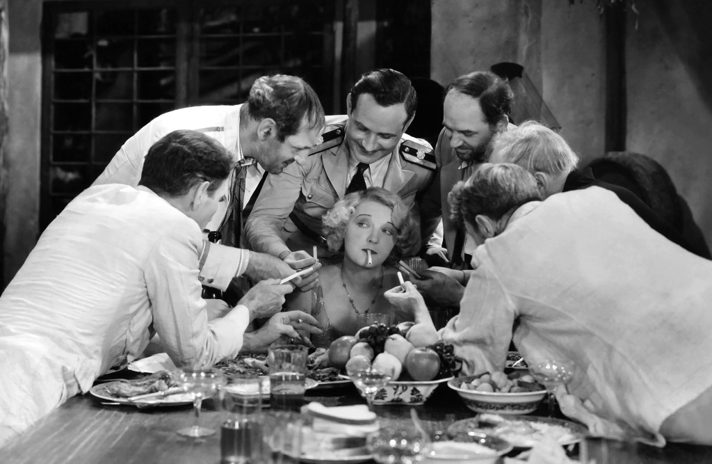 And so it goes until Gilda, going out of her mind with boredom and loneliness while waiting for Carl’s return finally breaks down. She joins the men in an orgiastic feast accompanied by lots of champagne and cigarettes. Although she returns to her monastic existence after the long night of drinking and sharing sordid backstories with the boarders, she has unintentionally ignited Bruno’s passion for her but he too is rejected: “Say big boy, I’ll tell you something you don’t know….I killed a man in New Orleans and I’m just as tough and hard as any of ‘em and the sooner you find it out the better. Now scram commadore!”