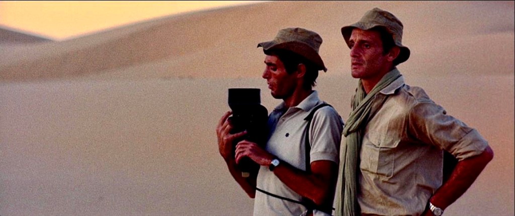 At the start of the movie, Paolo is leading a small safari deep into the desert as he films the pursuit of a frantic gazelle, trying to escape the jeep. Barbara Bates (Delia Boccardo), one of the tourists in the group, protests the treatment of the animal and pulls the key out of the ignition. When Paolo tries to start the jeep again, he discovers they are out of gas and the group is forced to walk some sixty miles out of the desert to be rescued. Things are looking grim as the stragglers become blistered by the sun and dehydrated but that doesn’t stop Paolo from filming their desperate situation. He says to the group, “If any of you in this extremely dramatic moment – you must realize the predicament we’re in – care to record a statement of any sort, you can do it now.” Paolo further antagonizes the travelers with hypothetical questions like, “Mrs. Bates, would you be unfaithful to your husband for a glass of water?”