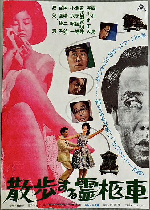 The Glamorous Ghost (Japanese Title: Sanpo Suru Reikyusha, 1964) is something of a rarity in Japanese cinema – a noir comedy. This is the sort of twisty, convoluted farce in which all of the main characters are greedy, immoral and deceitful and you end up rooting for Asami (Ko Nishimura), the taxi driver protagonist, only because he is a pitiful underdog with a simple dream – to retire and run a pig farm in the country. His plan to accomplish that, however, involves blackmail and worse and before The Glamorous Ghost reaches its macabre but amusing climax, most of the major players have departed this mortal coil.