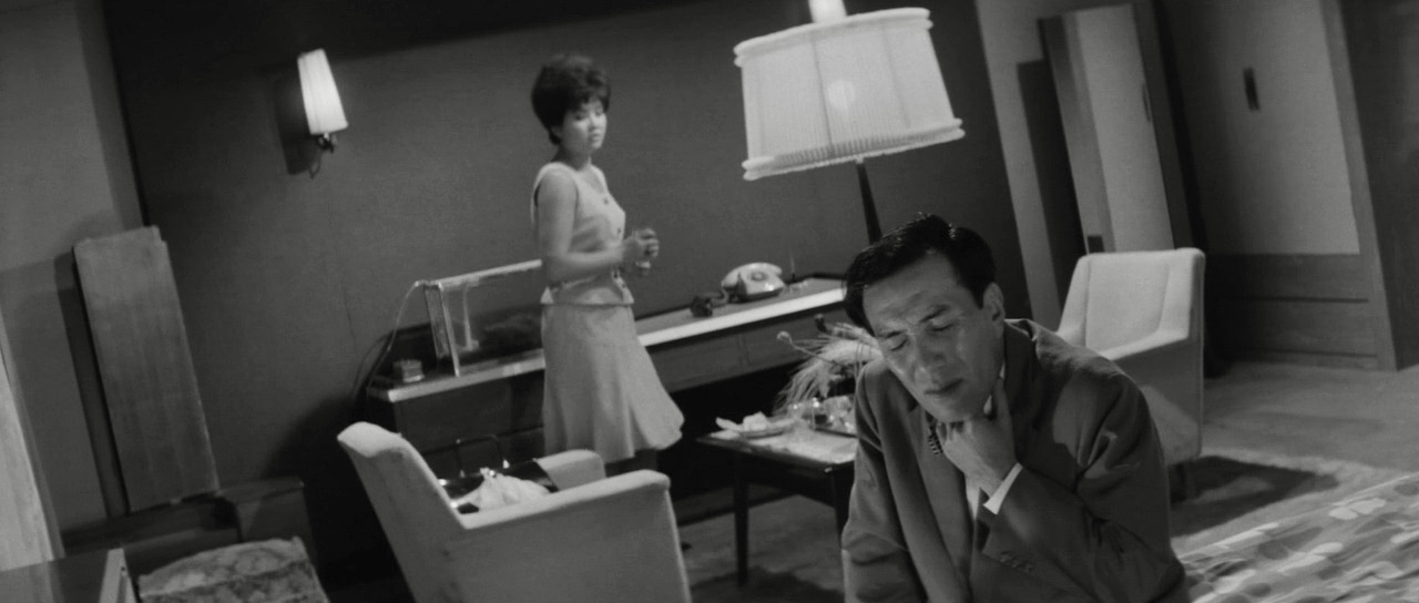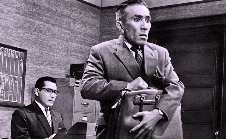 At first we suspect that Asami has killed Suji but the truth turns out to be the first major twist in this wicked black comedy. It soon transpires that the married couple has declared a truce and come up with an ambitious scheme to make a pile of money by blackmailing Suji’s lovers. It plays out like this: Asami announces Suji’s death by suicide and hires Mouri (Kiyoshi Atsumi), a hearst driver, to transport her coffin around town (she poses inside it as a corpse). The plan is to visit Dr. Yamagoshi (Nobuo Kaneko), a medical surgeon, and Yoshinosuke Kitamura (Meicho Soganoya), a wealthy businessman, both of whom are current lovers of Suji. They are also informed that she wrote letters to both of them before killing herself and, afraid of what the contents might reveal, the two men offer to pay off Asami for the letters and his discretion in the matter. The ruse works with Asami and Suji accumulating a fortune in excess of five million yen.