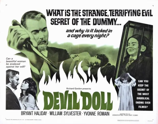 What scares you? Circus clowns, graveyards at night, enclosed spaces, bats ? For me, ventriloquist dummies are the stuff of nightmares and some of my favorite spine-tinglers are Dead of Night, the 1945 British horror anthology film featuring the “Ventriloquist’s Dummy” segment with Michael Redgrave, and “The Dummy,” a 1962 episode from The Twilight Zone starring Cliff Robertson as an unhinged ventriloquist…or is he? Lesser known but just as potent is a creepy little British B-movie entitled Devil Doll (1964), which is ideal viewing for Halloween or anytime.