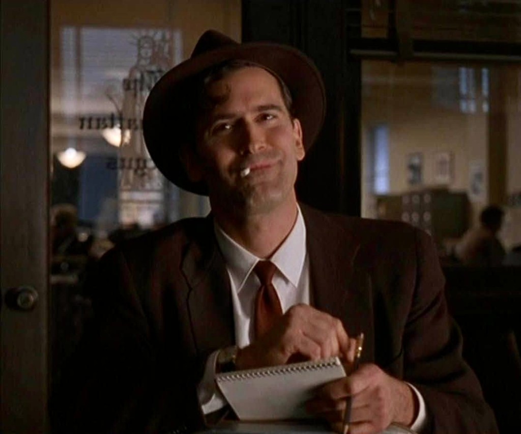 The entire film is an affectionate throwback to another era of Hollywood filmmaking and is loaded with classic movie references: Jennifer Jason Leigh’s performance as fast-talking reporter Amy Archer seems modeled on the Hildy Johnson character (played by Rosalind Russell) in His Girl Friday (1940); the massive, inner workings of the giant mechanical clock look like something out of Fritz Lang’s Metropolis (1926); the angel who saves Norville from a skyscraper high dive could have been inspired by the heavenly messenger in Frank Capra’s It’s a Wonderful Life (1946). There is even a Dean Martin homage a la Peter Gallagher’s cameo as a flashy lounge crooner who sings “Memories Are Made of This.” Last but not least is a delightful supporting cast that includes Bruce Campbell (star of Sam Raimi’s The Evil Dead), John Mahoney (of Frasier and In Treatment TV fame), Bill Cobbs (Ghosts of Mississippi, That Thing You Do!) and Jim True-Frost, who is currently featured in the TV crime drama American Rust.