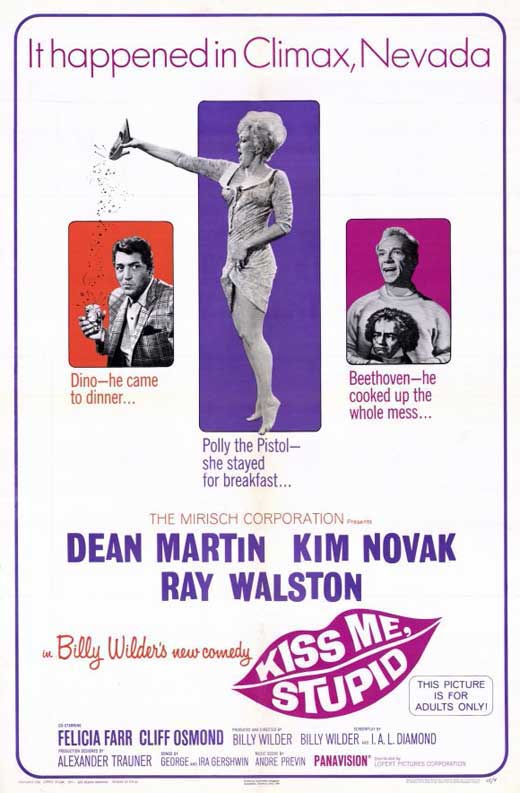 In contrast to Wife for a Night with its cast of elegantly dressed aristocrats cavorting against the background of Parma high society, Billy Wilder’s 1964 remake is at the other end of the spectrum. Set in an economically depressed backwater desert town – Climax, Nevada – the opera composer has become a frustrated songwriter (Ray Walston) who sees his big break when a famous Las Vegas singer (Dean Martin as “Dino,” a parody of his own persona) is stranded in his town. Felicia Farr plays the songwriter’s ignored and lonely wife and Kim Novak, in one of her most underrated performances, is Polly the Pistol, a local prostitute.