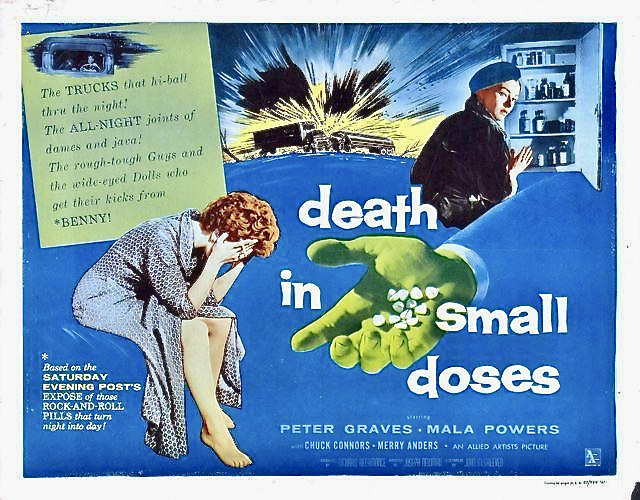 “The Pill Dragnet! Blasting the Blackest Market of all…the girl peddlers of the deadliest thrill for sale!” – one of the taglines for Death in Small Doses (1957).