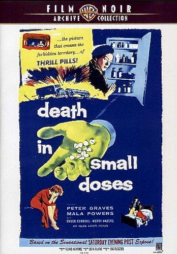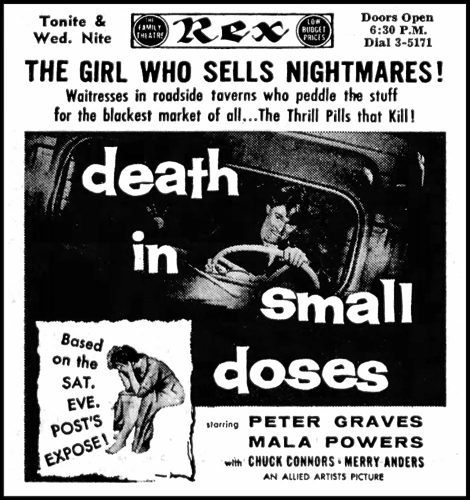 “The Pill Dragnet! Blasting the Blackest Market of all…the girl peddlers of the deadliest thrill for sale!” – one of the taglines for Death in Small Doses (1957).
