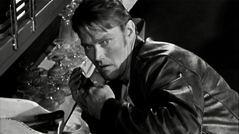 Under the name Tom Kaylor, the agent relocates to Los Angeles, complete with furnished references and a backstory, and promptly rents a room in a boarding house for truckers run by Valerie Owens (Mala Powers), whose husband was recently killed in a trucker road accident. One of the boarders is Mink Reynolds (Chuck Connors) and his introduction is preceded by blaring bebop jazz music from his room. As Valerie is showing Tom to his room, she knocks on Mink’s door, saying “Some people are trying to sleep.” At which point, Mink opens his door, totally wired and snapping his fingers like some beatnik hipster. His jive-ass comeback is “Zombies. They spend their crummy lives in the sack. I ask you what’s so great about sleep?”He then turns the music down, saying, “See. Quiet like a library. You can even hear the termites.”