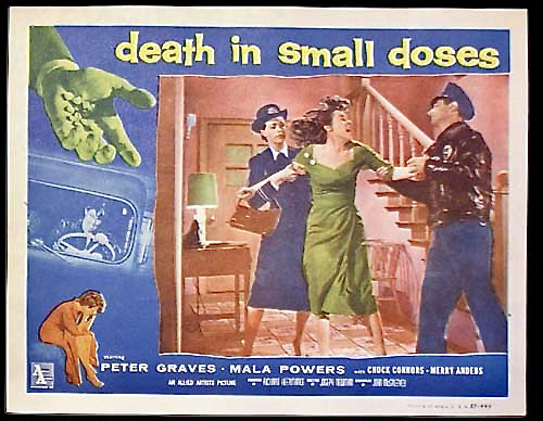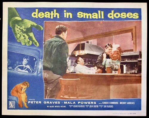 No relation to the 1995 made-for-TV movie of the same name directed by Sondra Locke and starring Richard Thomas and Tess Harper, Death in Small Doses begins on an ominous note with the distant headlights of a truck emerging out of the dark as it travels along a backroad in the middle of the night. The truck begins swerving and we get a windshield view of the cab with the highly agitated driver inside. He’s sweating profusely and trying to stay awake. Driving with one hand and trying to open a bottle of pills with the other, he soon downs enough bennies to keep him awake for the rest of his life….except that he starts hallucinating. He thinks he sees double headlight beams coming straight at him and swerves violently off the road at high speed, diving over a cliff and down a ravine to a spectacular crash below. Cue the doom-laden opening credit music by Robert Wiley Miller and Emil Newman (uncle of songwriter Randy Newman) and we know we’re in for a cautionary tale about the dangers of amphetamines. [Warning, spoilers on the road ahead.]