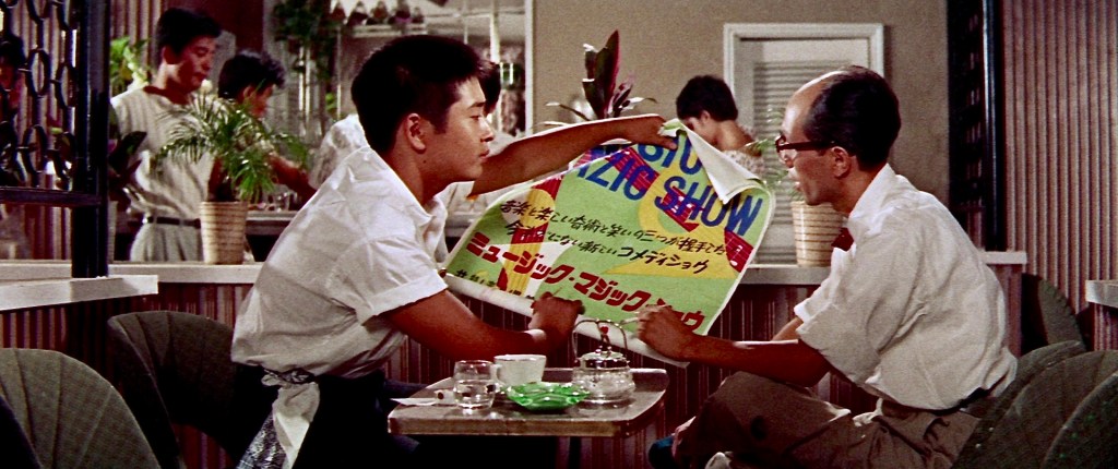 Suzuki’s fondness for the odd detail is also in evidence in scenes like a thumb wrestling match between Shintaro and Hercules or Kinyo’s ill-fated attempt to perform his famous handcuffed escape from a sealed box underwater. Like many of the incidents in The Wind-of-Youth Group, the latter scene unfolds in a surprising and unpredictable manner with a tragic payoff. But there is little time for mourning in this 85-minute tale and the carnival troupe is forced to move on to their next destination with a new identity.