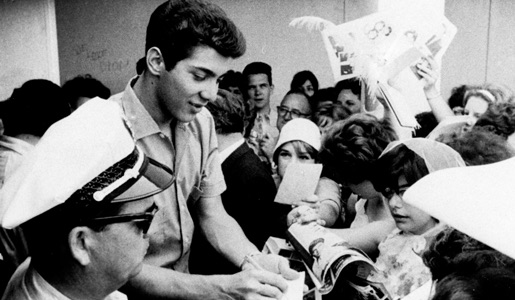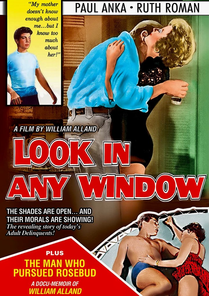 In Anka’s second feature, The Private Lives of Adam and Eve (1960), a tawdry sex comedy with fantasy dream sequences, the teen idol was completely overshadowed by his more experienced co-stars Mickey Rooney, Mel Torme, Tuesday Weld and Mamie Van Doren (again). Other than singing the theme song, he was not showcased in any breakout musical numbers. Look in Any Window, on the other hand, was Anka’s first – and last – starring role in a dramatic film and probably the oddest entry in his sporadic movie career. Not surprisingly, Anka’s best film role is playing himself in the superb but rarely seen documentary Lonely Boy (1962), a candid portrait of the singer at the height of his teen popularity directed by Wolf Koenig and Roman Kroitor for the National Film Board of Canada.