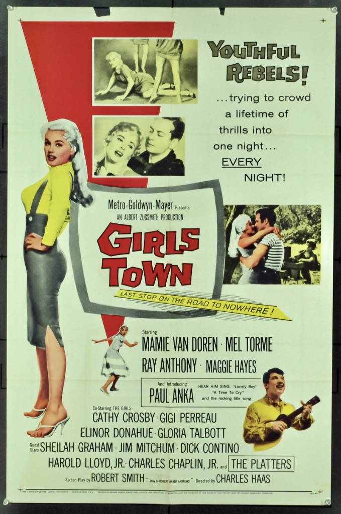 Despite Anka’s massive fame and successes as a teen idol, his forays into film acting were minor efforts and not tailored to his unique talents or chosen with an eye on his fan base. His first official screen credit was for singing the theme song to Samuel Fuller’s Verboten! (1959), a troubling look at budding Neo-Nazis and young German nihilists in the wake of post-WWII Berlin. Girls Town (1959), a low-budget juvenile delinquent drama with Mamie Van Doren as a trouble-making vixen named Silver Morgan, marked Anka’s first on-screen film role and he got to perform four songs including “It’s Time to Cry” and his hit, “Lonely Boy.” But despite his special “Introducing Paul Anka” credit, it’s really little more than an extended cameo in a B-movie vehicle for Ms. Van Doren (and her husband at the time, bandleader/musician Ray Anthony, in a leading role).