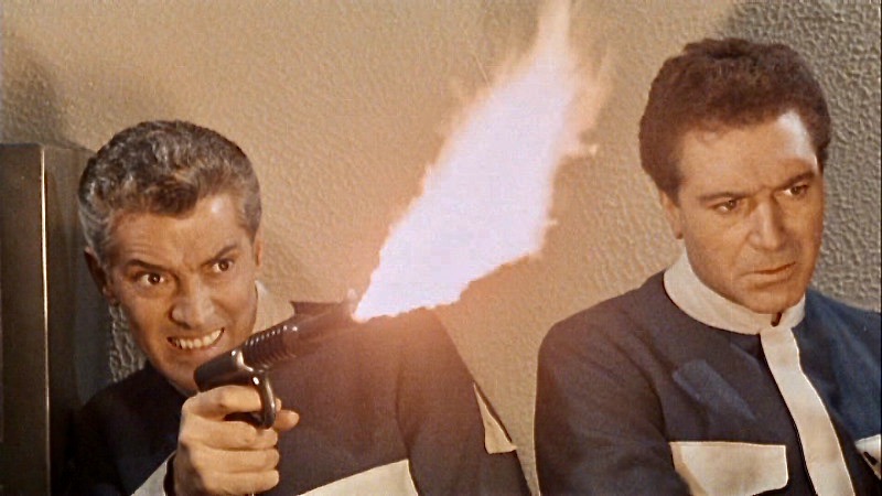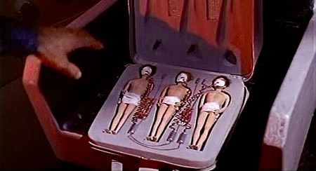 The outrageous premise has Dr. Nurmi (Massimo Serato) attempting to create a race of super beings on Delphos, a planet owned by “The Corporation.” To achieve this goal, Nurmi has instructed his minions to kidnap top scientists and athletes from Earth for experiments. The abductions, which are accomplished by shrinking the victims and placing them in specially created suitcases, are soon traced to Delphos. When Gamma I Commander Mike Halstead (Tony Russel) eventually leads an expedition there, he not only learns of Nurmi’s master plan but also discovers that his girlfriend, Connie Gomez (Lisa Gastoni), is going to be fused together with Nurmi in a procedure that will produce one all-perfect being.