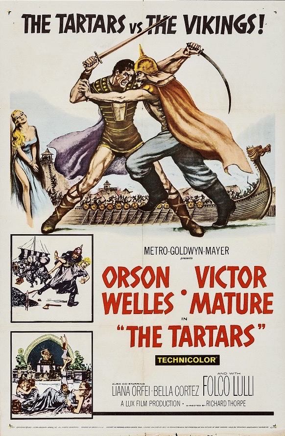 “Hordes storm fortress!” “Tartars Abduct Viking beauty!” “Orgy celebrates conquest!” These were some of the tag lines used to promote the period epic The Tartars (1961), one of many European imports that reached American shores during a brief “sword and sandal” craze in the late fifties/early sixties. Hercules, the 1959 peplum sensation starring Steve Reeves, started it all. Producer Dino De Laurentiis bought the rights and distributed it in the U.S. in 1959, transforming it into a box office hit. After that, every major studio was scrambling to duplicate that success and MGM was no exception, importing such muscle-bound contenders as The Giant of Marathon (1960), Morgan the Pirate (1961) and The Son of Spartacus (aka The Slave, 1963) – all of them starring Steve Reeves. The Tartars, however, had a different pedigree and a more distinctive one. Not only was it helmed by Richard Thorpe, one of MGM’s most dependable directors of costume epics (Ivanhoe (1952), The Prisoner of Zenda (1952), Knights of the Round Table, 1953), but it sported two high profile marquee names – Victor Mature and Orson Welles.