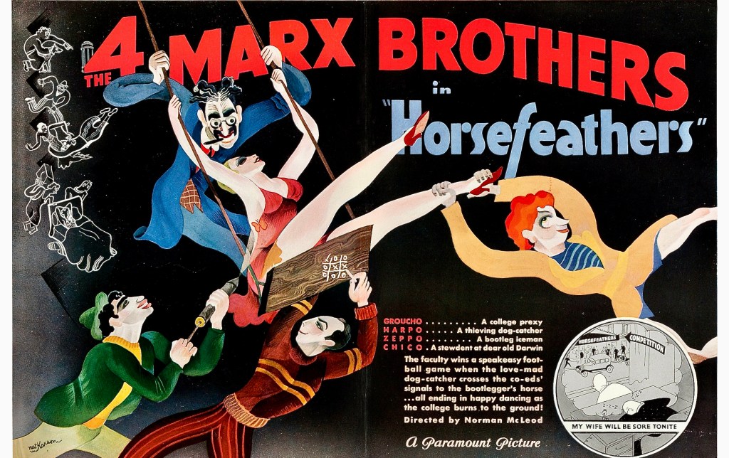 College life and the behavior of students and facility alike has been a source of inspiration for countless satires and parodies on the subject from the silent era (Harold Lloyd in The Freshman [1925], Buster Keaton in College [1927]) and early sound period (Laurel & Hardy in A Chump at Oxford [1939]) on up to more contemporary examples such as National Lampoon’s Animal House [1978], Van Wilder [2002] and Accepted [2006]. Certainly one of the funniest and most memorable of all is Horse Feathers (1932), a madcap burlesque of university life starring The Marx Brothers in which the institution of higher education is held up for ridicule and satirized mercilessly.