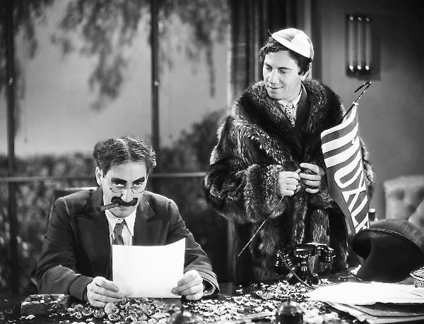Along the way, there is a parody of the boating accident from Theodore Dreiser’s novel, An American Tragedy, wild sight gags like Harpo posing as a human coffee dispenser, and such signature songs as “Whatever It Is, I’m Against It” and “Everyone Says I Love You” (Woody Allen would pay homage to this six decades later when he chose it for the title of his 1996 musical comedy). The film continually flaunts its ramshackle structure and at one point during Chico’s piano solo, Groucho breaks the wall between actor and viewer to remark candidly, “I’ve got to stay here but there’s no reason you folks shouldn’t go out into the lobby till this thing blows over.”
