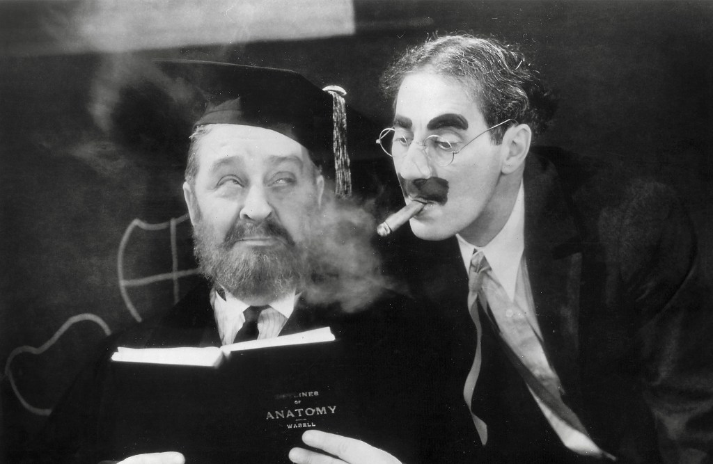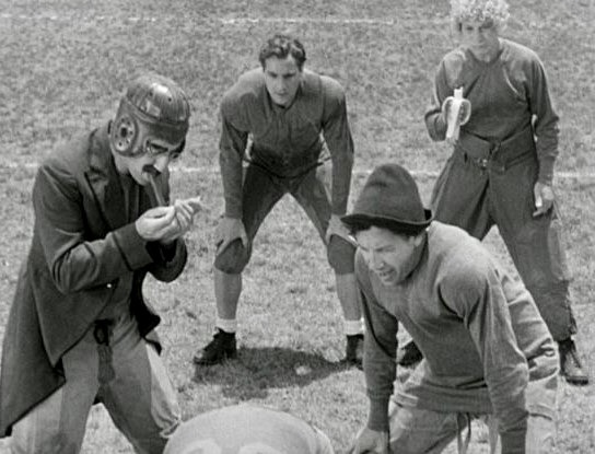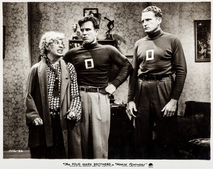 Among the three, only Perelman had attended college and it is his absurdist view of academia that gives Horse Feathers its sharp, satiric edge. After all, he had suffered through four undergraduate years at Brown University where he spent most of his time attacking the university’s policies in scathing editorials for the Brown Jug. In one of his attacks, he wrote “Millions for athletics, and not a cent for aesthetics” which turns out to be one of the major themes running throughout Horse Feathers.