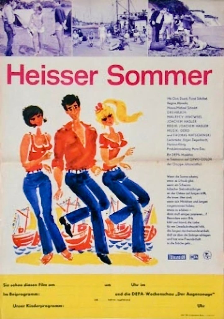 While you might expect the bulk of these films to be dreary, cheerless propaganda films which extoll the virtues of farm collectives or present inspirational odes to Marxism, the reality is something else. In many ways, the DEFA films resemble Hollywood studio releases in terms of narrative techniques and genre. The difference is that the East German filmmakers were charged with imparting socialist messages, whether it was regarding morality, ethics, or role models. Yet that didn’t stop some of them from making such seemingly frivolous entertainments as Joachim Hasler’s Heiber Sommer (English title: Hot Summer, 1968), a Beach Party-like musical about a group of students vacationing at a farm on the Baltic Sea. In between the choreographed musical numbers and various romantic subplots, an obvious theme emerges through the character of Brit (Regine Albrecht), a free-thinker whose self-centered interests disrupts the group’s harmony. In a typical Hollywood-like happy ending, Brit comes to realize the error of her ways and commits herself to being the perfect party member. Some of you may have seen scenes from this film in the highly entertaining 1997 documentary East Side Story in which director Dana Ranga presented a toe-tapping survey of Communist musicals. Highly recommended if you haven’t seen it and a great entry point for East German cinema.