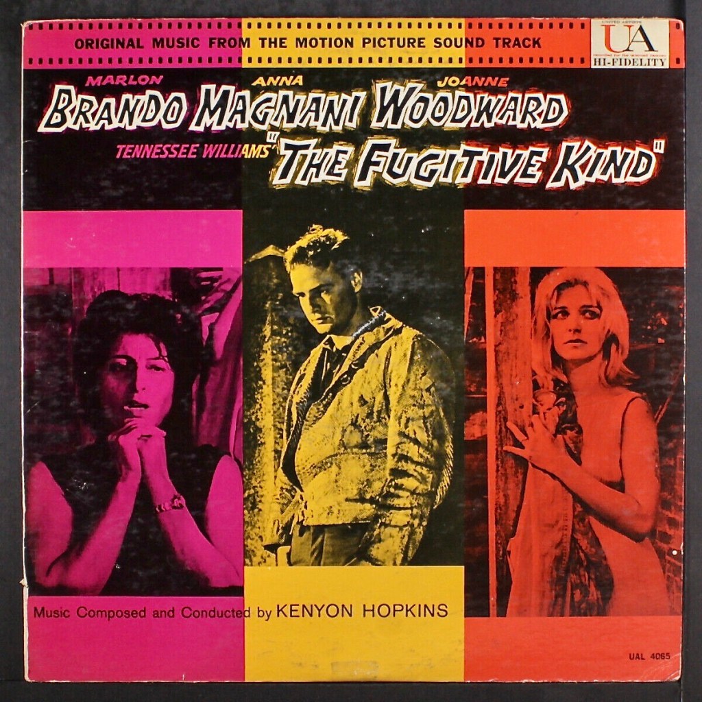 The following excerpt is from an excellent overview of the film and the soundtrack by Ross Care on the Film Score Monthly web site. Care wrote, “In 1957 he scored two films for Sidney Lumet: The Strange One and 12 Angry Men, making experimental use of modernistic 12-tone techniques for the former. Hopkins reunited with Lumet for The Fugitive Kind to provide an intimate, lyrical “less is more” (both in mood and scale) score that served the film extremely well…Hopkins’s intimate and lyrical main title, “Bird Song,” while reflecting the atmospheric cinematography of a sunrise behind which (after a brief visual/musical prologue) the credits unfold, also seems inspired by one of the key symbols in Williams’s script, the image of the delicate transparent birds who touch earth only when they die…This main title is one of the most lyrical, poignant and concentrated of any music composed for a Williams film, and the rest of the score, primarily for guitar, solo and sectional reeds, and judiciously utilized strings and brass (mostly French horns), follows suit.”