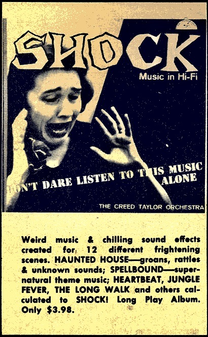 According to an interview with record collector Mickey McGowan for Re/Search Magazine’s Incredibly Strange Music issue, Volume 1, “The Creed Taylor Orchestra made Shock Music in Hi-Fi, which bore a warning, “Don’t dare listen to his music alone!” It’s a masterpiece from the beginning, starting with loud heartbeats. “The Crank” effectively conveys the fear which a crank phone call can inspire. “The Secret” features a man and a woman laughing conspiratorily, and raises the question: “Is a secret still a secret once it’s told.” Creed Taylor’s follow-up album was Panic: the Son of Shock. Both of these LPs should also be credited to the film composer Kenyon Hopkins….You hear heavy breathing, whispering, clapping, heartbeats, shudders, screams – a whole gamut of effects. After these two masterpieces, Hopkins hit paydirt in the mid-60s with Nightmare, which has the sound of a plague of locusts coming in for the kill. “Chamber of Horrors,” besides sounding like a horror music soundtrack, really is beautiful…..He used the sound of a telephone ringing to create incredible suspense; he used footsteps, creaking doors and glass breaking to dreadful effect….He recorded a few more albums including Lonelyville, which is great private-eye jazz…He recorded a series of Verve Sound Tours in which he took the music of a given country…and mixed in the sounds of people at a sidewalk café in Paris….He also did…Riding the Rails – the cover shows two fashion models who’ve just “hopped a freight.”