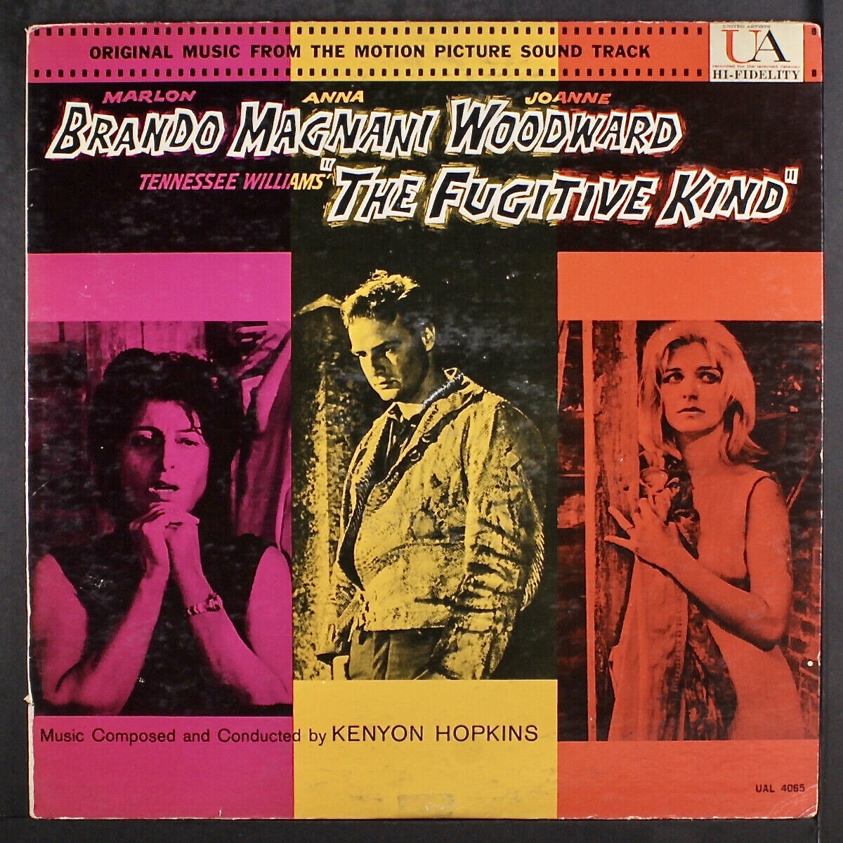 The following excerpt is from an excellent overview of the film and the soundtrack by Ross Care on the Film Score Monthly web site. Care wrote, “In 1957 he scored two films for Sidney Lumet: The Strange One and 12 Angry Men, making experimental use of modernistic 12-tone techniques for the former. Hopkins reunited with Lumet for The Fugitive Kind to provide an intimate, lyrical “less is more” (both in mood and scale) score that served the film extremely well…Hopkins’s intimate and lyrical main title, “Bird Song,” while reflecting the atmospheric cinematography of a sunrise behind which (after a brief visual/musical prologue) the credits unfold, also seems inspired by one of the key symbols in Williams’s script, the image of the delicate transparent birds who touch earth only when they die…This main title is one of the most lyrical, poignant and concentrated of any music composed for a Williams film, and the rest of the score, primarily for guitar, solo and sectional reeds, and judiciously utilized strings and brass (mostly French horns), follows suit.”